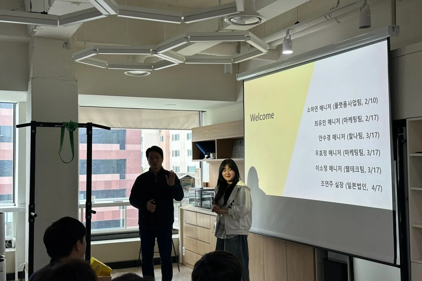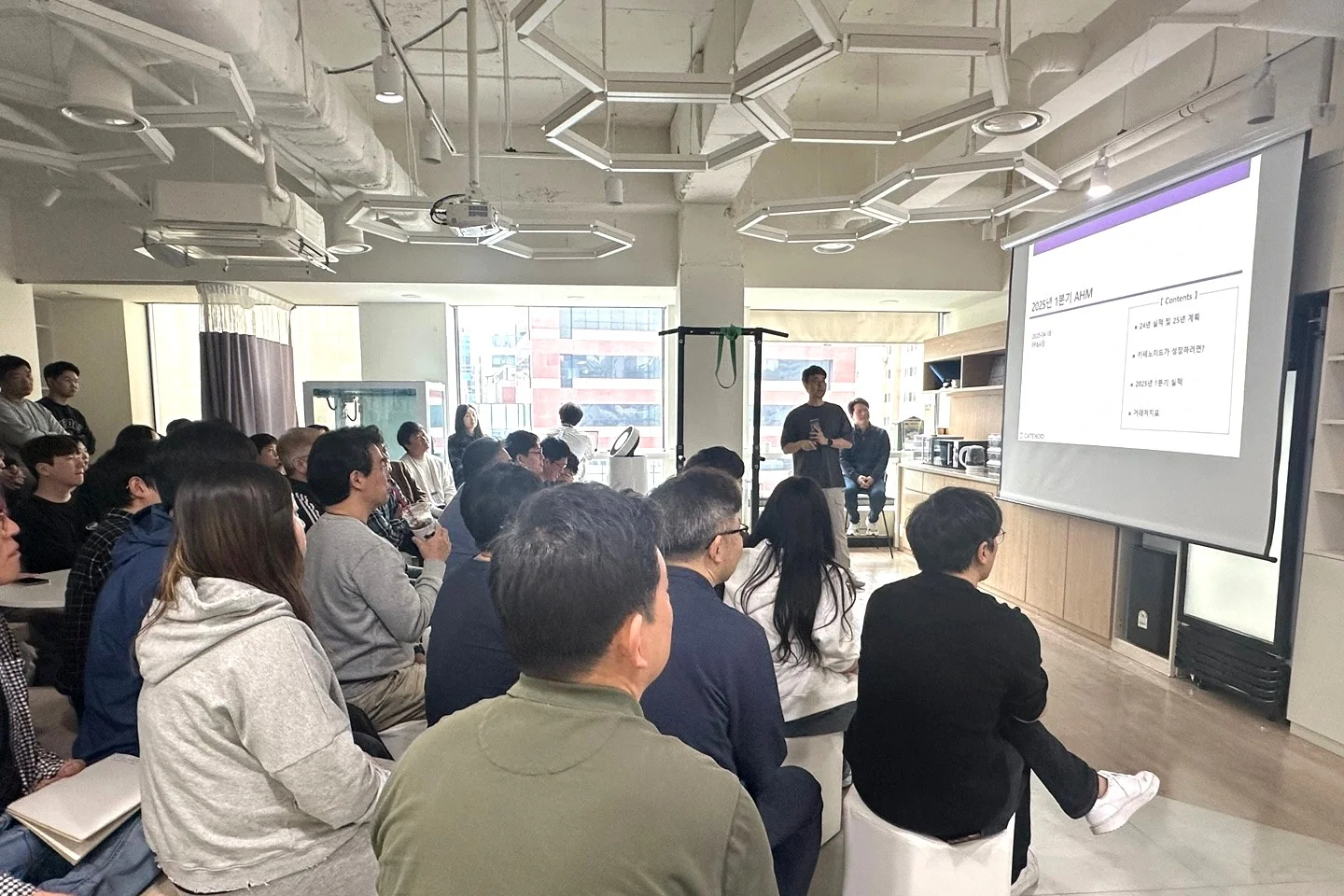 그리고 이번 올핸즈 미팅에서는 새롭게 합류한 팀원들의 간단한 자기소개 시간도 있었습니다. 카테노이드 사무실은 두 개의 층으로 분리되어 있어서 층 간 교류가 많지 않은데요. 전 임직원들 앞에서 함께 일하게 된 기대와 각자의 다짐을 짧게나마 공유하며 서로의 얼굴을 익힐 수 있는 좋은 기회가 되었습니다.