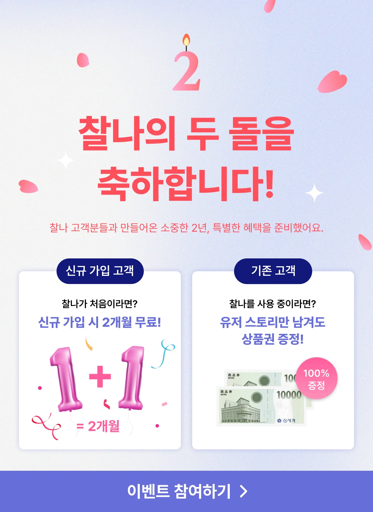 그동안 찰나를 믿고 함께해주신 모든 고객분들께 진심으로 감사드리며, 이 마음을 담아 2주년 이벤트를 준비했습니다👏 5월 한달 간, 오직 지금만 누릴 수 있는 특별한 혜택을 만나보세요!