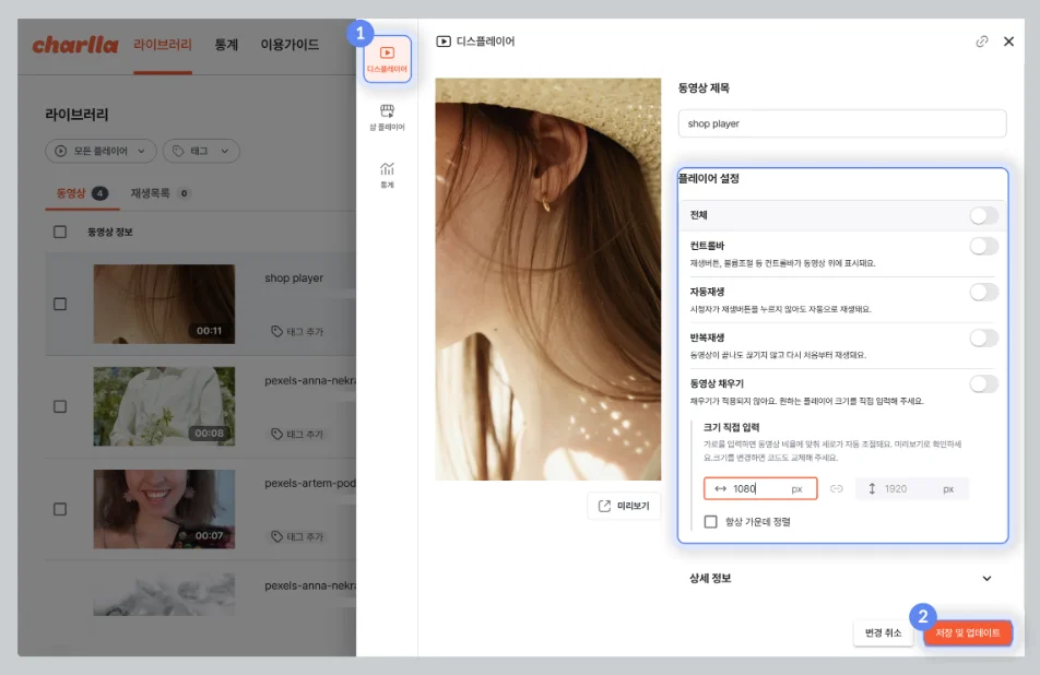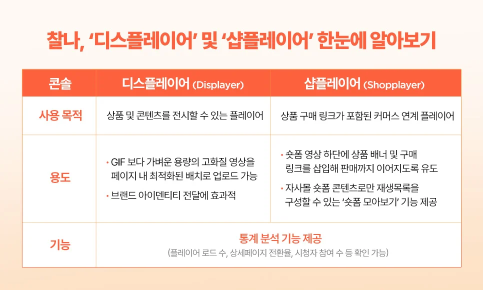 디스플레이어는 쇼핑몰 사이트 내 적용 가능한 플레이어로 상품 정보를 영상으로 게시할 때 상세 페이지 레이아웃에 최적화된 화면을 제공해주며, 샵플레이어는 상품 구매 링크를 포함한 플레이어로 영상 콘텐츠와 상품 판매 연계가 가능합니다.