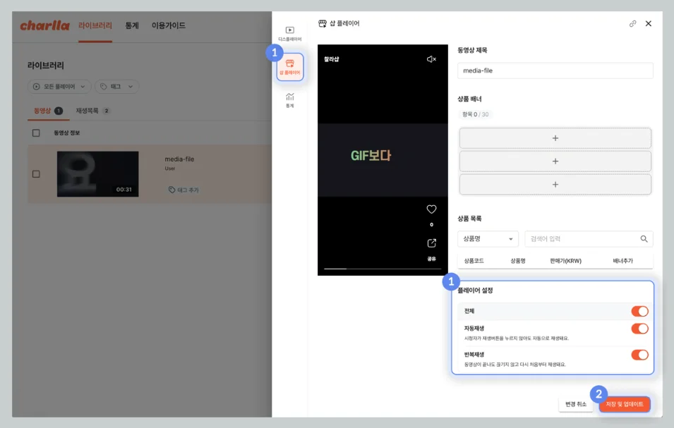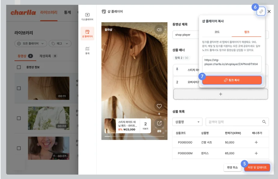 설정한 플레이어의 코드 또는 링크를 복사해 HTML 편집기에 붙여 넣으면, 온라인쇼핑몰이나 자사몰에서 바로 적용할 수 있습니다.