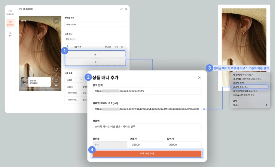 상품 배너 추가 팝업에서 플레이어에 연결하고 싶은 상품 상세페이지 주소, 썸네일 이미지 주소, 상품명, 가격 입력 후 [저장] 버튼 클릭