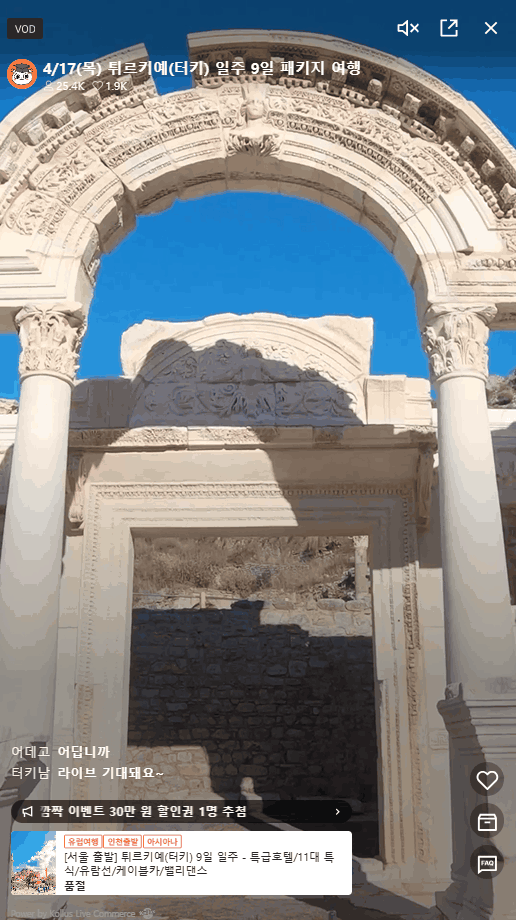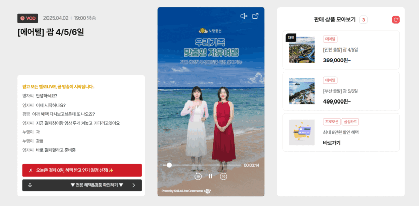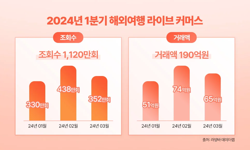 숏폼 뿐만 아니라 라이브 방송도 큰 인기를 얻고 있는데요. 라이브 커머스 데이터 분석 플랫폼 ‘라방바 데이터랩’에 따르면 2024년 1분기 해외여행 라이브 커머스 조회수는 1,120만회, 거래액은 190억원을 기록할 정도로 시장 규모가 확대되고 있습니다.