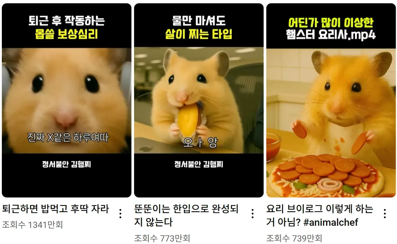 최근 인기를 끌고 있는 정서불안 김햄찌 유튜브 채널은 AI 음성·영상 기술을 활용해 햄찌 캐릭터를 만들었다고 하는데요. 이는 롱폼 콘텐츠 뿐 아니라 숏폼 콘텐츠에도 마찬가지로 적용됩니다. AI로 제작된 콘텐츠는 쉽게 숏폼 콘텐츠로 재생산 되고, 배포할 수 있기 때문에 이 채널은 AI가 만들어낸 콘텐츠가 얼마나 빠르게 소비자에게 확산될 수 있는지 잘 보여주고 있어요.