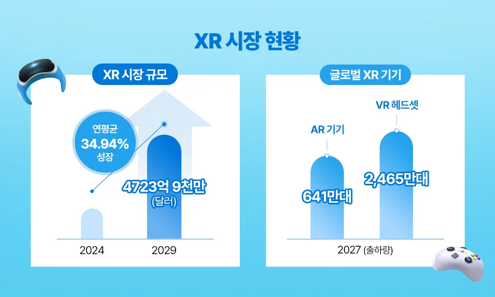 시장조사기관 모더인텔리전스는 XR 시장 규모가 연평균 34.94% 성장해 2029년까지 4723억9000만 달러에 이를 것으로 예측했어요. 올해 초 열린 CES 2025와 MWC 2025에서도 인공지능(AI)와 결합된 다양한 형태의 XR기기와 기술이 공개되며 큰 화두가 되기도 했답니다.