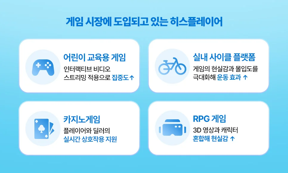 히스플레이어의 유니티, 언리얼용 플러그인을 사용하면 게임 내 트위치(Twitch)와 같은 비디오 스트리밍을 삽입할 수 있어요. 또 히스플레이어 HTML5 SDK를 활용해 인터랙티브 OTT앱을 마이크로소프트(MS) 엑스박스(Xbox)나 소니의 플레이스테이션(PlayStation) 환경에 적용할 수 있습니다.